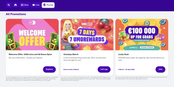 Casumo Casinolla rakennamme kampanjat niin, että ymmärrät edun arvon jo ennen kuin aktivoit sen. Pelaajille, jotka etsivät Casumo-kasino Suomessa, tarjontamme keskittyy vahvaan tervetuliaisetuun, säännöllisiin palkintokampanjoihin sekä uskollisuuspolkuun, joka seuraa pelaamistasi selkeästi. Jos sinulla on jo tili, Casumo-kirjautuminen vie sinut suoraan bonuslompakkoon ja ajankohtaisiin missioihin. Kun Casumo-promokoodi vaaditaan, näytämme sen tarjouskortissa, joten sinun ei tarvitse arvailla.